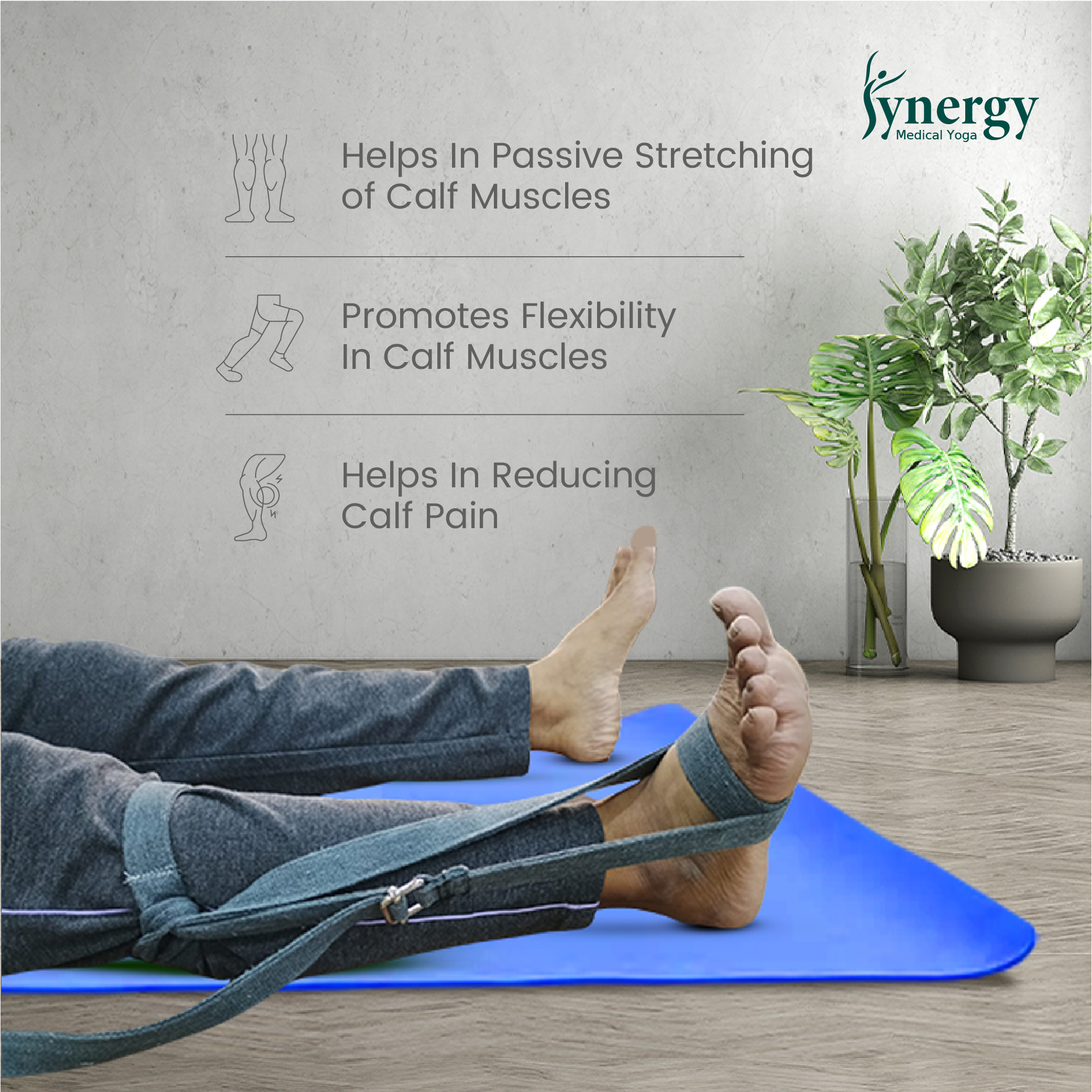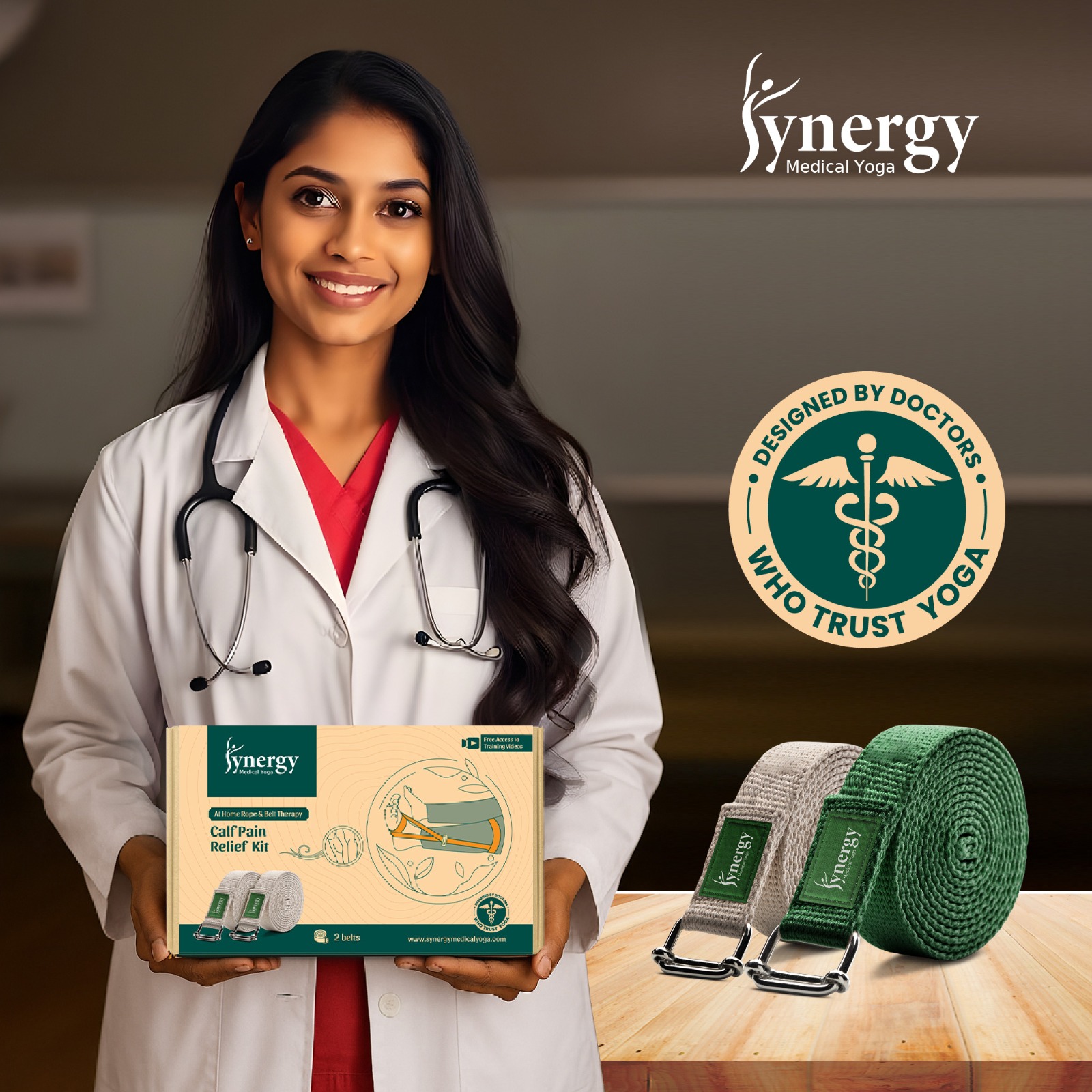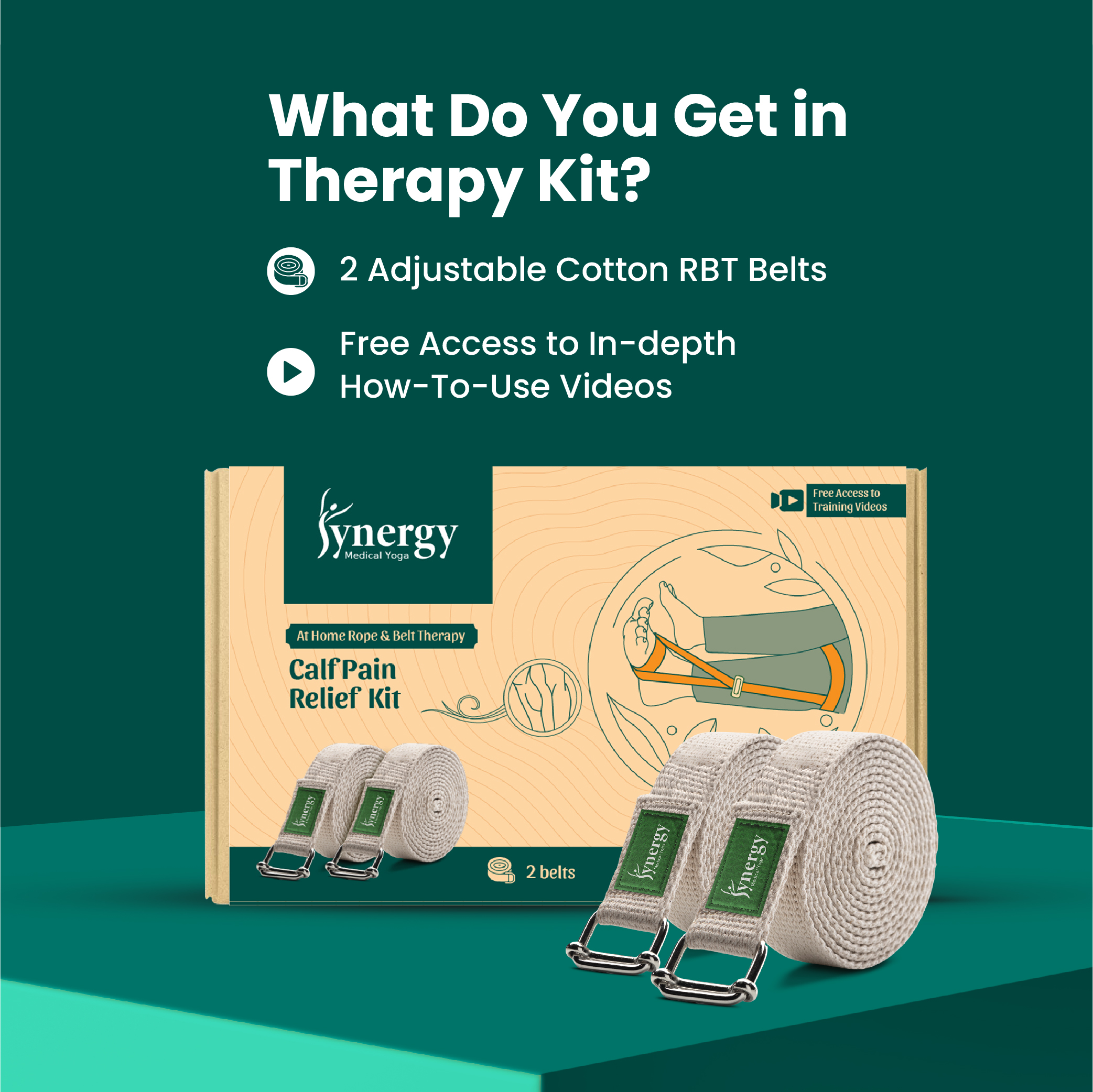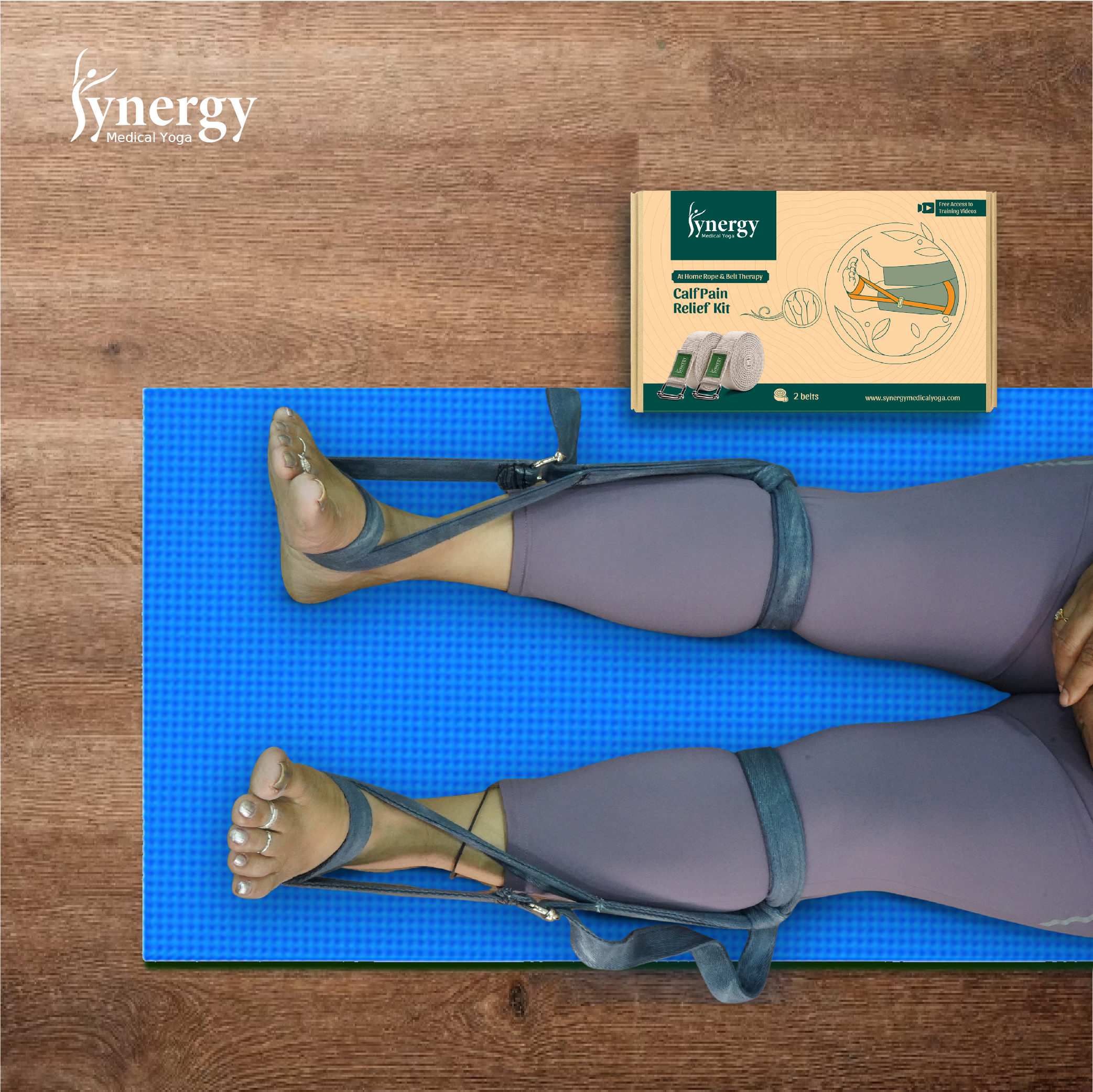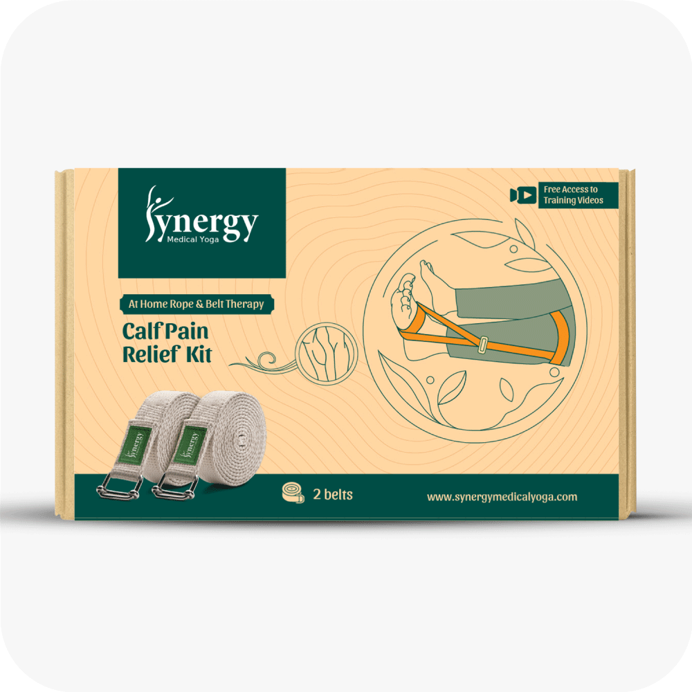 The Calf Pain Relief Kit (2 Belts) provides targeted support through Synergy Medical Yoga Rope & Belt Therapy principles, designed to help alleviate discomfort in the calf muscles